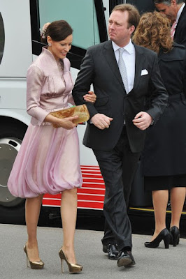 Prince Gustav of Sayn-Wittgenstein-Berleburg and Carina Axelsson arrive to attend the christening of Crown Prince Frederik and Crown Princess Mary's twins at Holmens Kirke on April 14, 2011 in Copenhagen, Denmark.